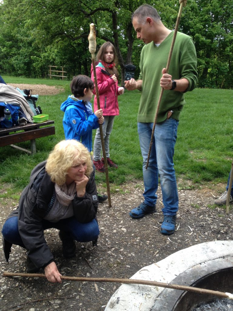 Die Elternschaft der Uhlandschule lud am Freitag Abend zu einem Ausflug auf den Arbachspielplatz ein. Nachdem das Wetter die Woche zuvor nicht mitspielte, ließ die sonnige Woche Alle auf einen trockenen Abend des 17. Mai hoffen. Nach einem kurzen, aber heftigen Regenschauer, trafen sich insgesamt 20 unerschrockene Eltern und Großeltern mit ihren Kindern, bzw. Enkel zusammen mit KollegInnen der Uhlandschule und liefen mit Bollerwagen, Grillstecken und Stockbrotteig ausgerüstet zum Arbachspielplatz. Nach kurzer Zeit brannte ein ordentliches Feuer, über dessen Glut etwas später sehr leckeres Stockbrot gebacken und Würstchen gegrillt wurden.